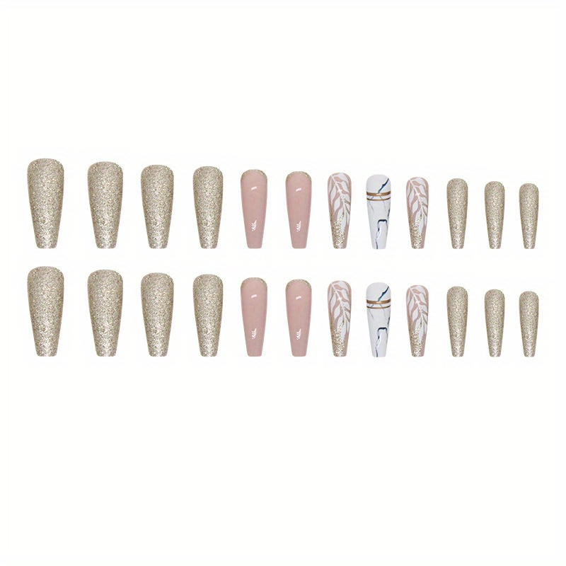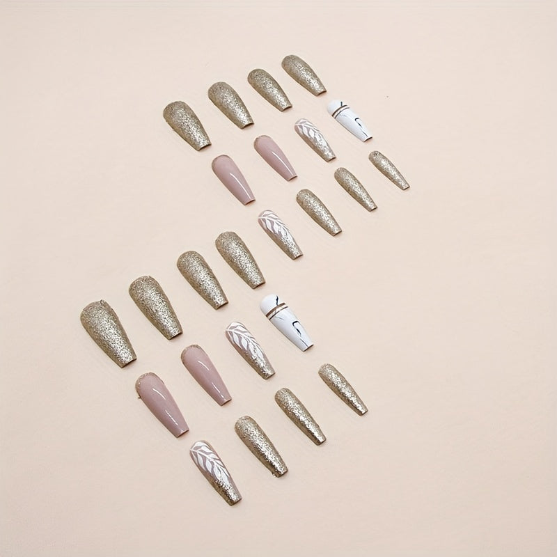 24pcs Dazzling Golden Glitter Ballerina False Nails - Chic Long Press-On with Delicate White Leaves Design - Seasonal Nail Art for Fashion-Forward Women & Girls