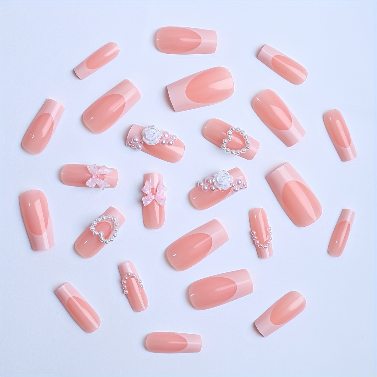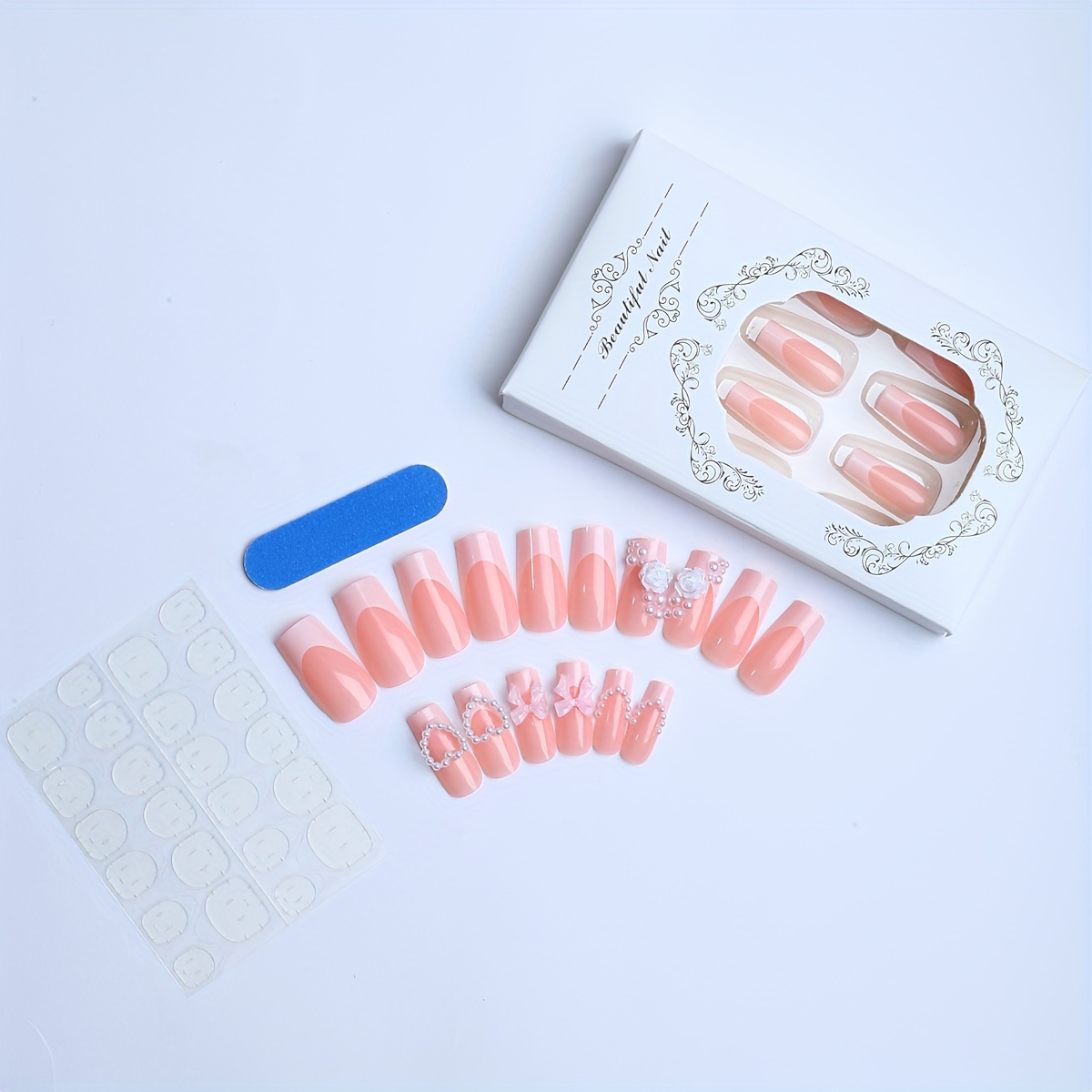 24pcs/set Medium Square White French Tip Acrylic Nails - 3D Bow and Heart Shaped Faux Pearl Design, Glossy Glue On Nails with 1pc Jelly Glue and 1pc Nail File Included for Women and Girls
