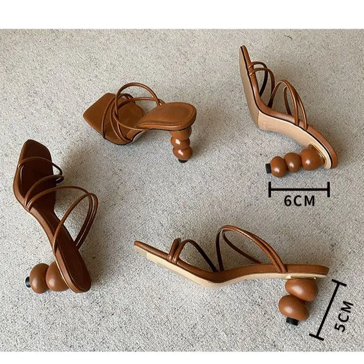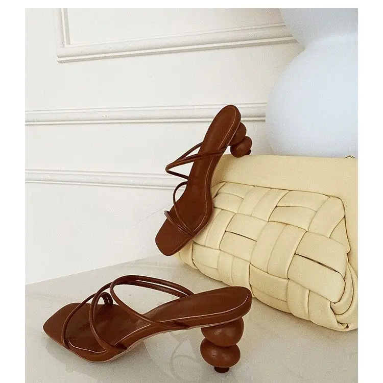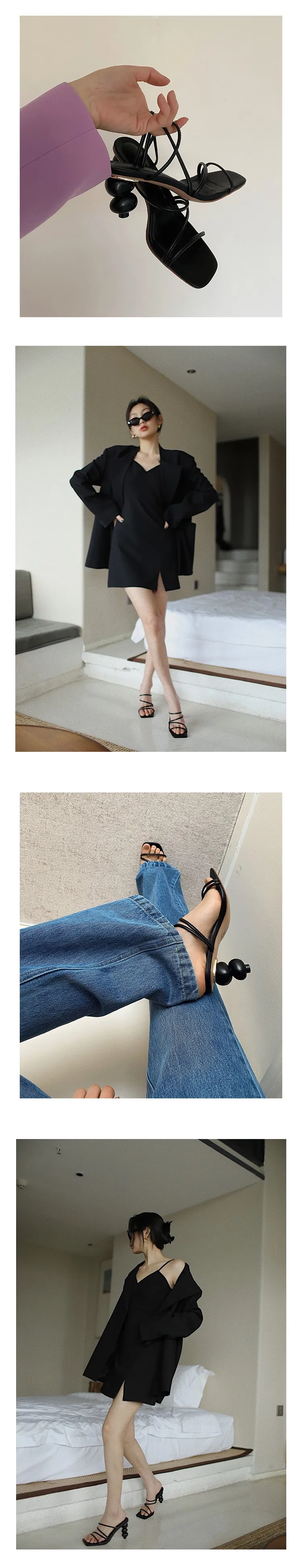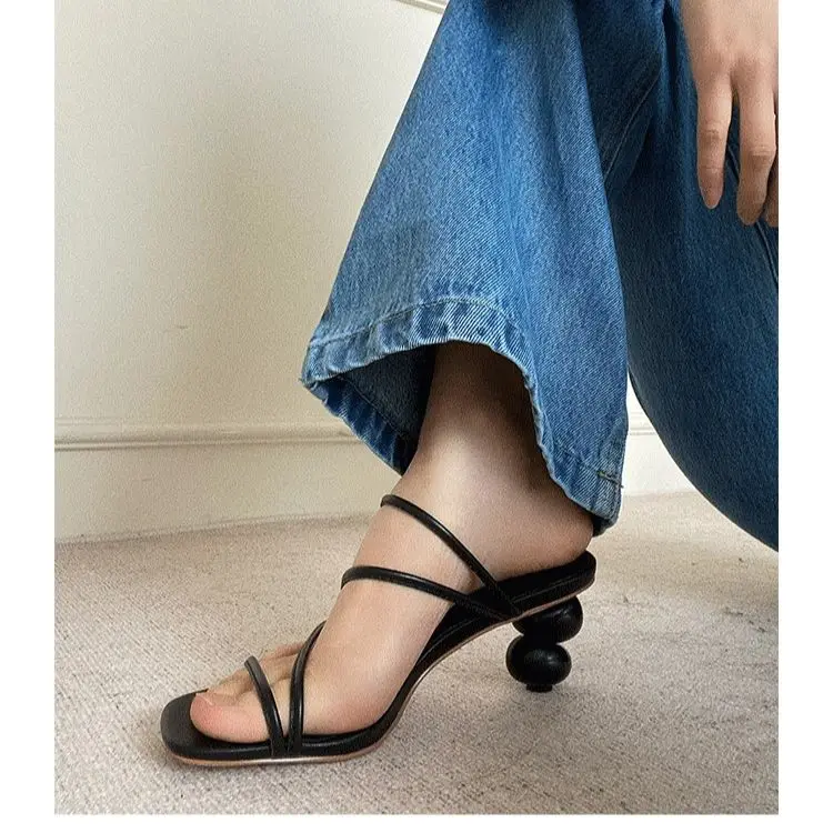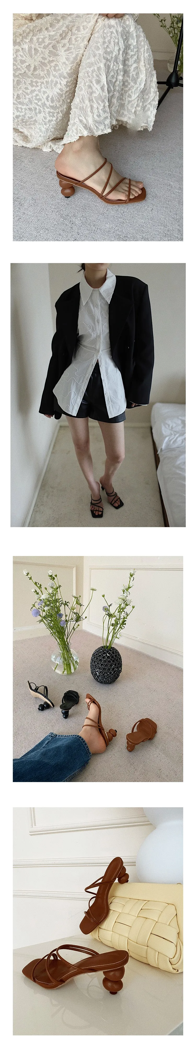 Ball Shape Heels Square Toe Slim Straps Slingback Sandals Hollow Slip-On High Heels Women's Summer Footwear