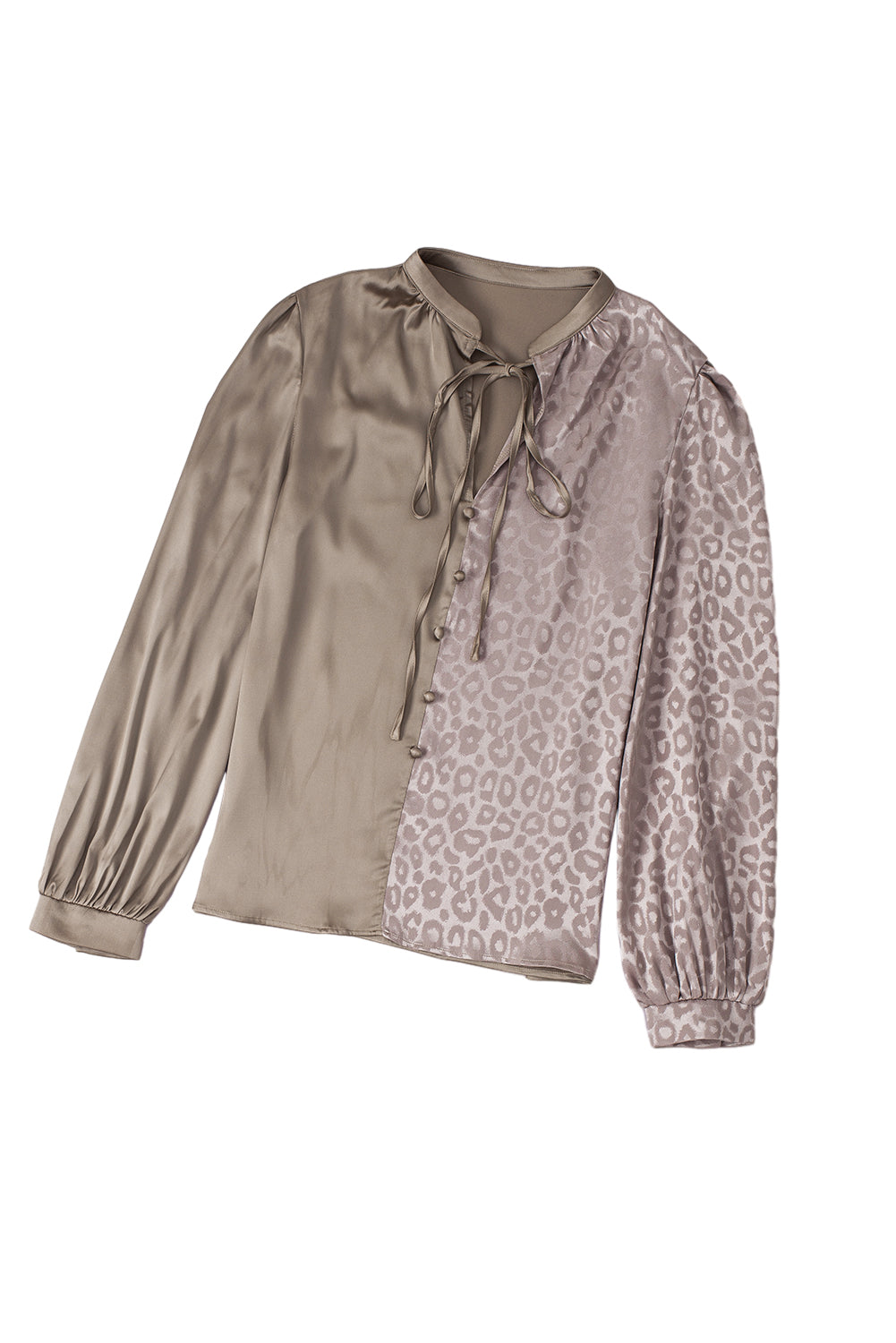 Light French Beige Contrast Half Leopard Jacquard Satin Blouse